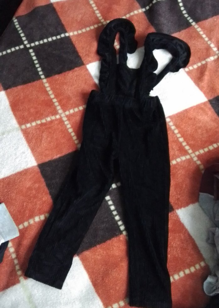 Kızlar için siyah, yumuşak ve sıcak dokulu, askılı ve tokalı tulum. Gotik tarzda, desensiz ve dar kesim.