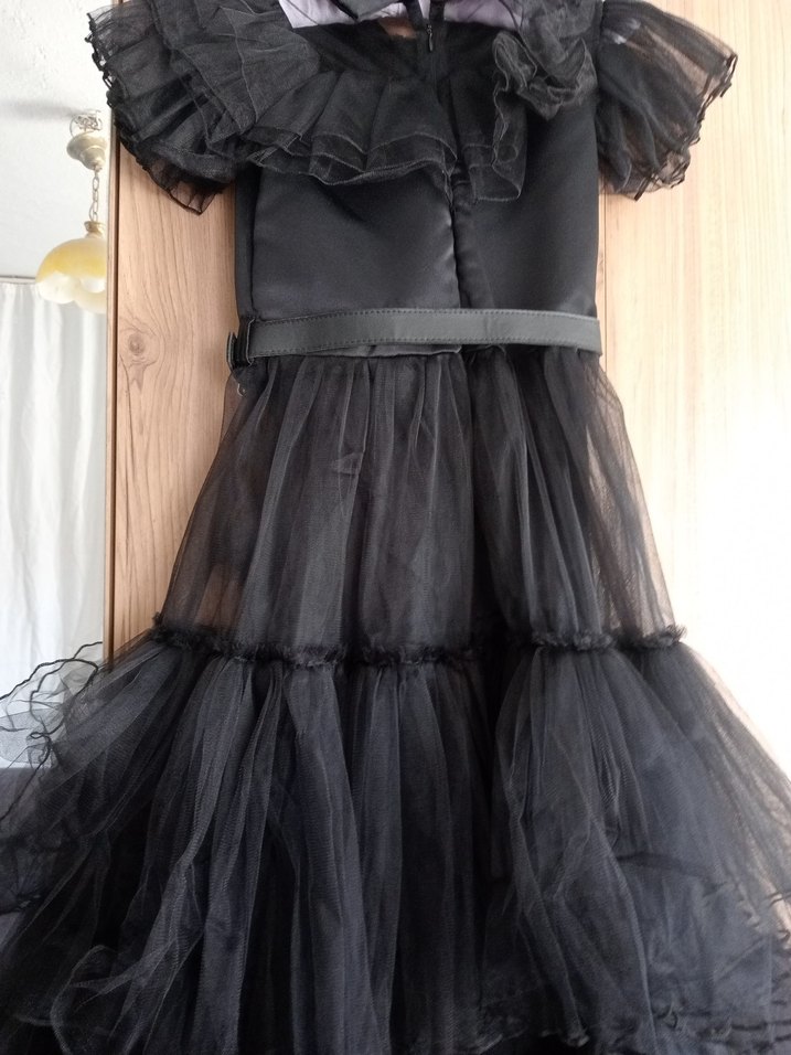 Kızlar için siyah, straplez yaka, fırfırlı ve askılı kollu gotik tarza uygun dar kesim elbisedir. wednesday kostüm