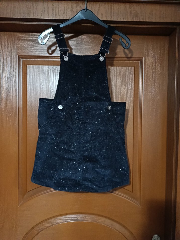 Kızlar için siyah kadife kumaştan, askılı ve tokalı, gotik tarzda etek Parlak detaylar içerir.