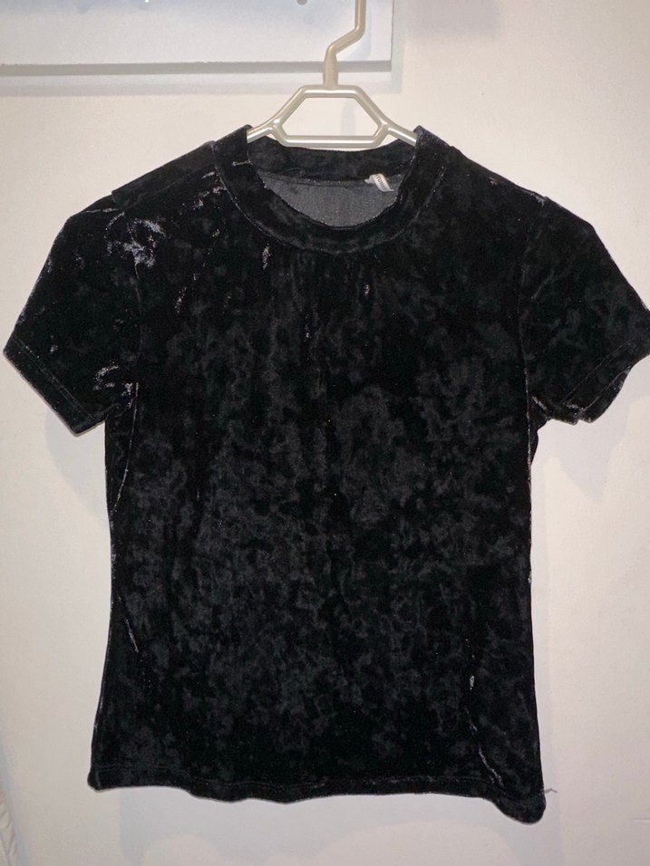 Kısa kollu, yuvarlak yaka ve dar kesim kız gömleği. Sentetik kumaştan, koyu renkli batik deseniyle trendy gotik tarzda.