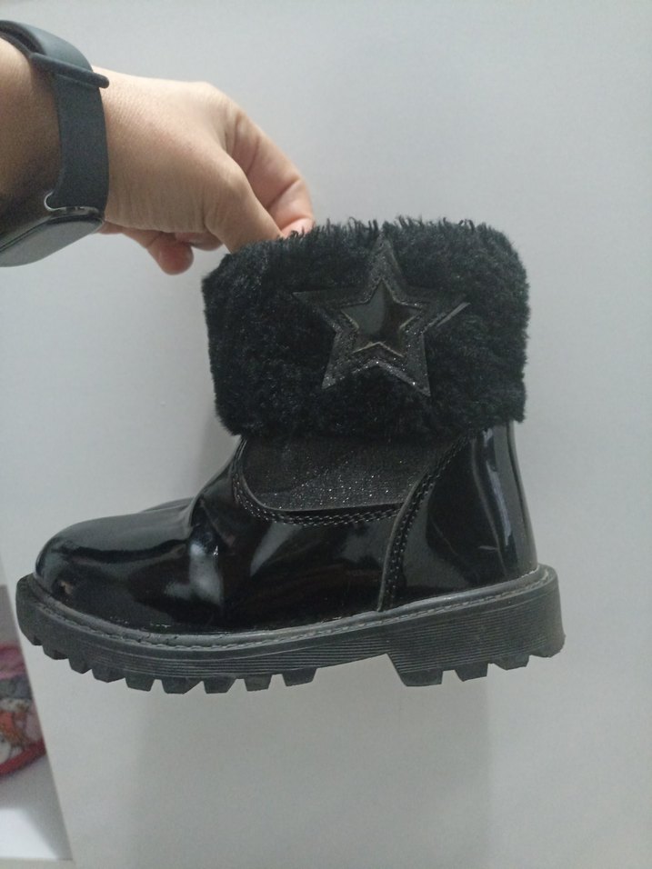 Kızlar için siyah kauçuk bot, kürk detaylı ve nakışlı yıldız desenli. Goth tarzında, rock punk havası taşıyan sağlam tabanlı parlak yüzeyli bot.
