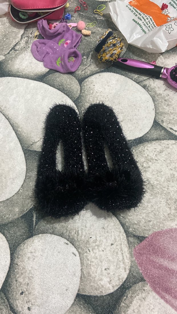 Siyah renkli, işlemeli detaylara ve kürklü süslemeye sahip kızlar için gotik tarzda ev terliği. Kauçuk tabanlı, modaya uygun ve öncü tasarım. Çeyizlik