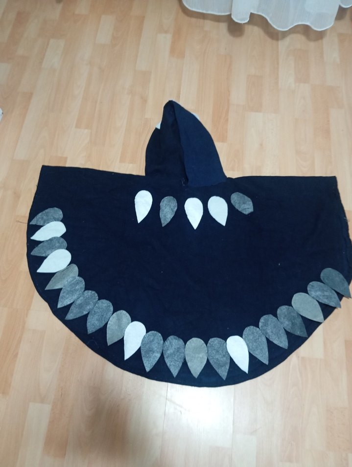 Siyah kız panço, uzun kollu, bol kesim ve yakası yırtmaçlıdır. Yumuşak, sıcak kumaştan yapılmış, nakışlı damla desenleri ve fırfır detayları vardır. Bohem ve retro tarzı yansıtır. çocuk gelişimi ödevimdi polar vs için kullanılabilir kendim diktim el dikişi