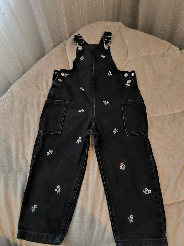 Nakışlı küçük çiçek desenleriyle süslenmiş, bol kesim siyah kot kız tulumu. Ayarlanabilir tokalı askılar ve büyük ön cepler bulunur.