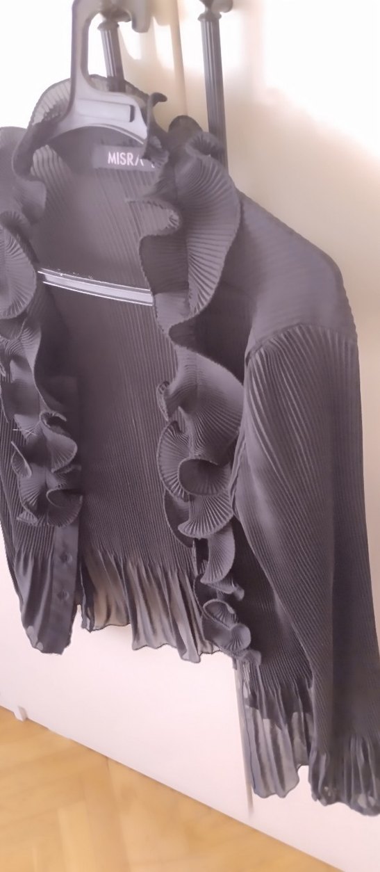 Siyah ve gri tonlarda, pilili detaylara sahip, yüksek yakalı ve uzun kollu, oturan kesim kız bolero. Sentetik kumaştan, gotik tarz için uygun.