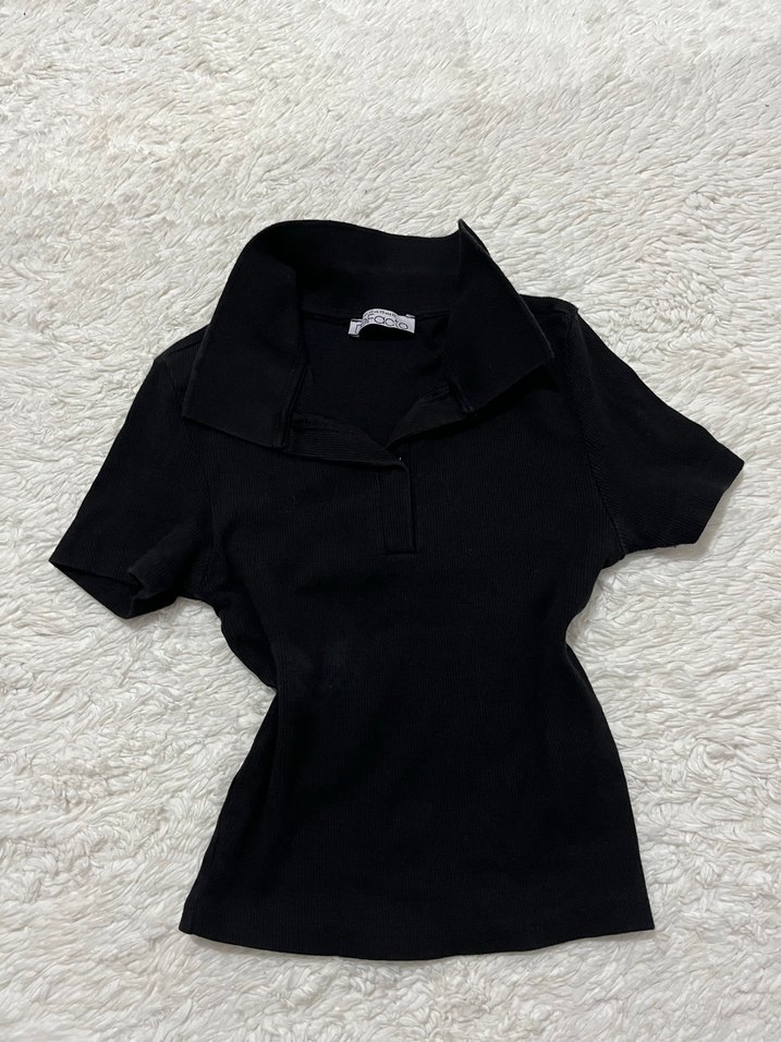 Kısa kollu, yakalı ve siyah renkte, sentetik kumaştan üretilmiş, dar kesim kızlar için polo tişört.
