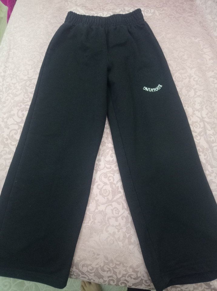 Kızlar için siyah, rahat kesim pantolon. Yumuşak ve sıcak kumaş, elastik bel kısmı ile konfor sağlar. Sade tasarımıyla rahat kullanıma uygundur. Bol paçalı 6_7 yaş eşofman altı
