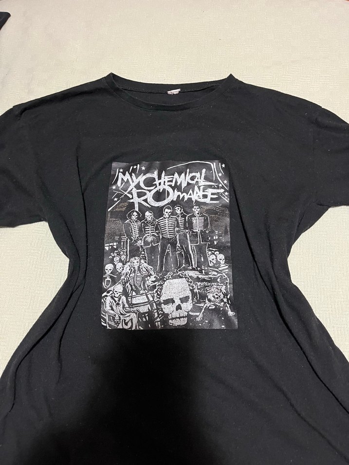 Siyah, gevşek kesim kız tişörtü, kısa kollu ve baskılı rock punk deseniyle. Sentetik kumaştan, yuvarlak yaka.