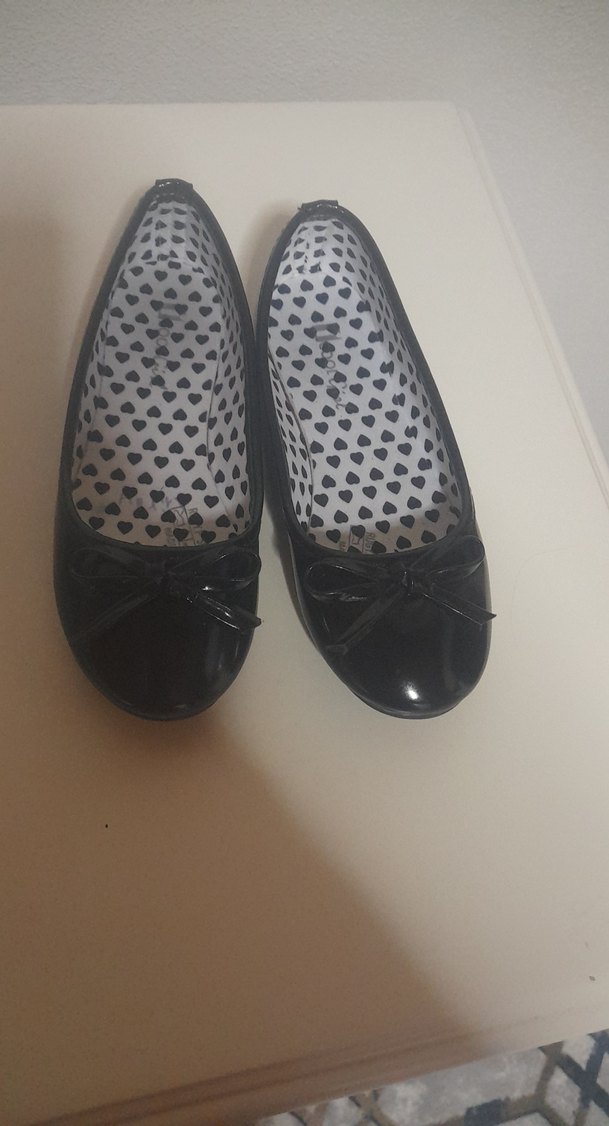 Kızlar için siyah rugan, fiyonk detaylı, içi kalp desenli rahat babetler.