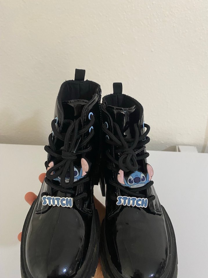 Siyah rugan goth botlar, nakış detaylı ve cırt cırtlı kapamalı. Stitch figürlü, karanlık ve punk tarzı botlar.