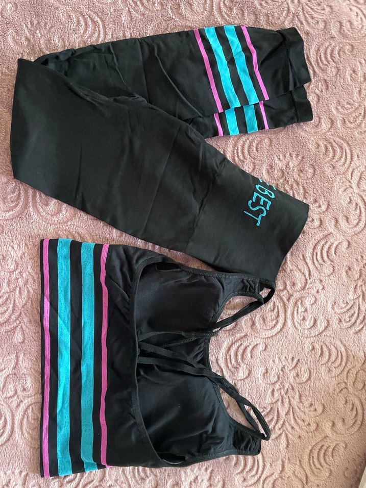 Kızlar için fit kesim, askısız üst ve elastik bel detaylı eşofman altı, pembe ve mavi şeritlerle sokak modası tarzında.