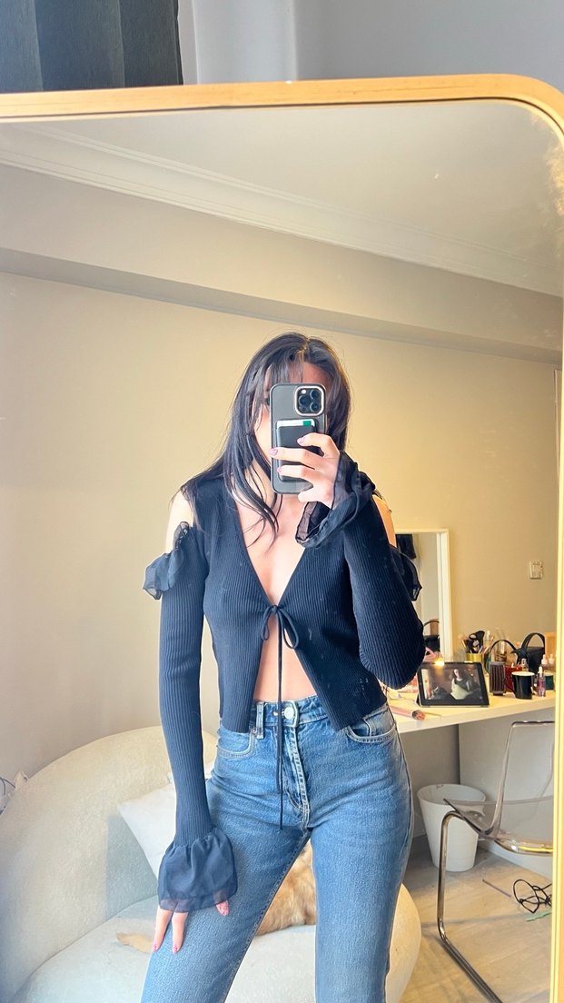 Kızlar için siyah, straplez yakalı ve önü bağlamalı, uzun kollu, dar kesim denim bolero. Trendy sokak stili için uygun.