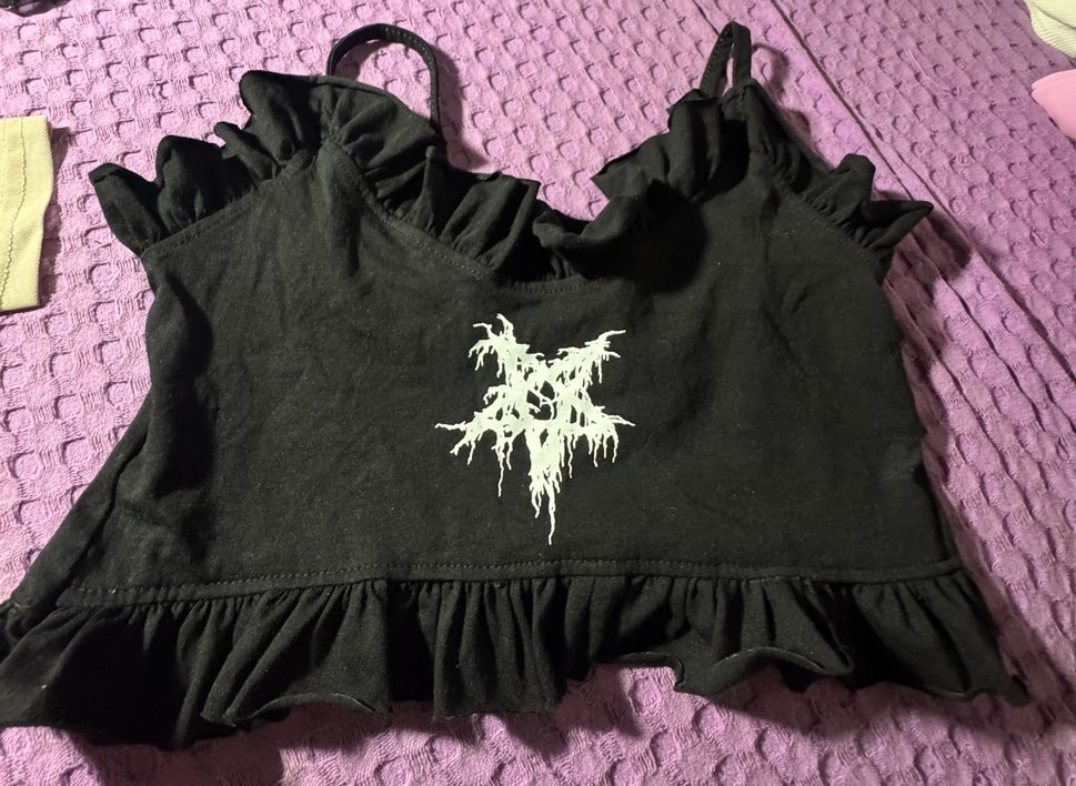 Kızlar için siyah, straplez, fırfırlı ve askılı body. penye kumaştan , crop ve gotik tarzda.