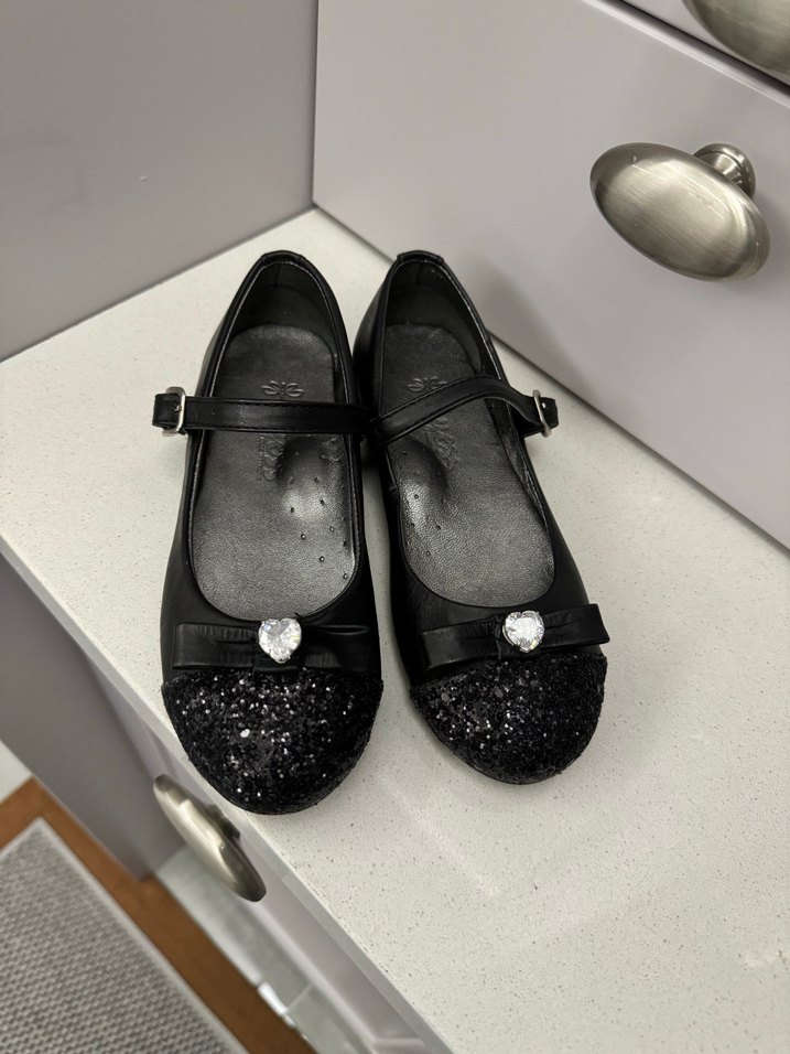 Siyah tokalı kız babet, simli burun kısmı ve küçük kalp süslemeli, klasik şıklık sunar. Kauçuk malzemeden yapılmıştır. bg tyess marka anatomik taban
