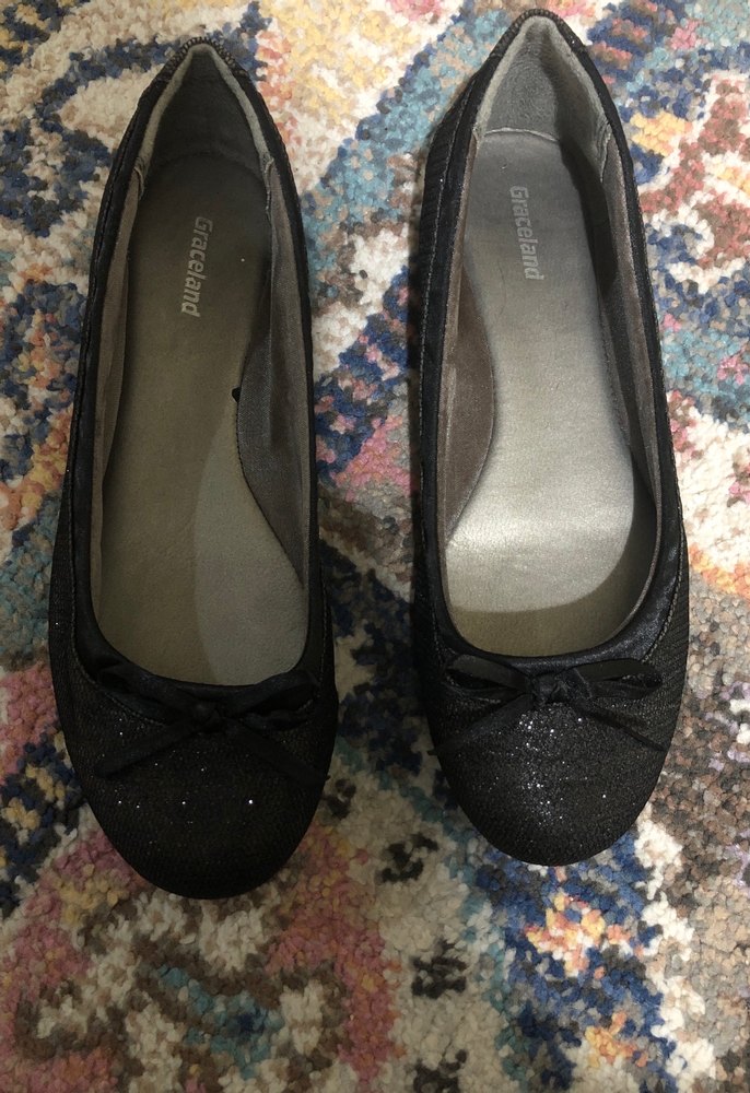 Kızlar için siyah renkte, tokalı ve lastik malzemeden yapılmış goth tarzı bale düz ayakkabılar. Önünde küçük bir fiyonk detayı bulunur. Bi tanesinin içinde hafif soyulma olmuş zararsız fotoğraf ta belli. Onun dışında bir sorunu yok.