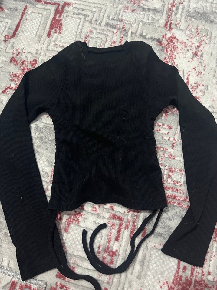 Kızlar için uzun kollu, yuvarlak yaka ve örgü dokulu siyah bluz. Sentetik yumuşak kumaştan, gotik tarz için uygun.