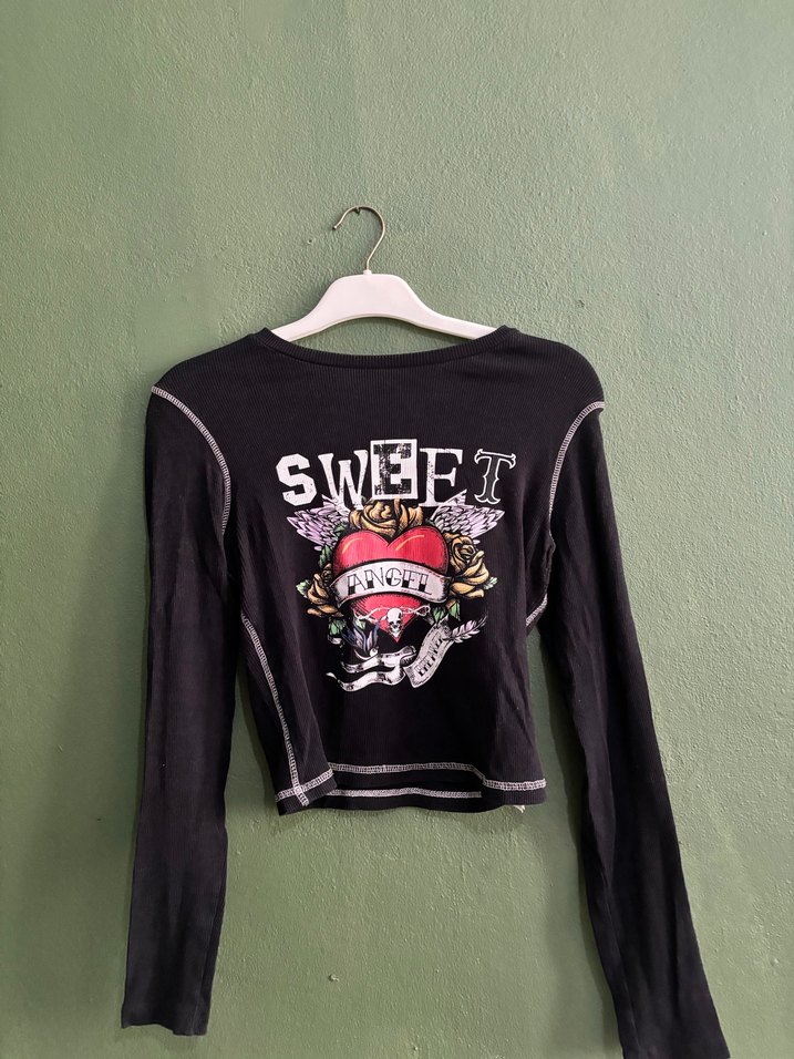 Siyah süet kumaştan, uzun kollu ve düğmeli, fitted kesim kızlar için tişört. Arka tarafında "SWEET" yazılı baskı ve rock punk tarzı desen bulunur.
