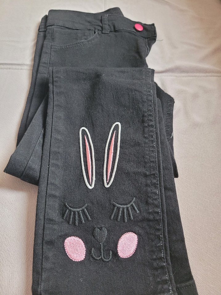 Sentetik kumaştan yapılmış, nakışlı tavşan desenli, siyah goth tarzı kız pantolonu.