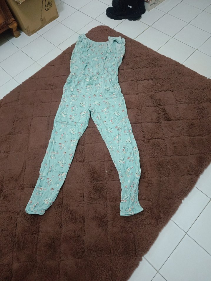 Yumuşak ve sıcak kumaştan, dantel detaylı, turkuaz renkli, kolsuz ve bol kesim tulum.
