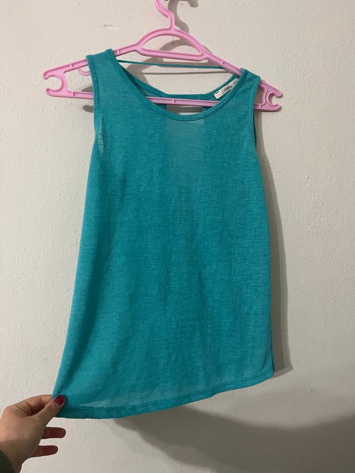 Kolsuz, turkuaz renkli, keten kumaştan yapılmış, yuvarlak yakalı ve bol kesim kızlar için üst. Rahat ve şık bir sokak stili sunar.