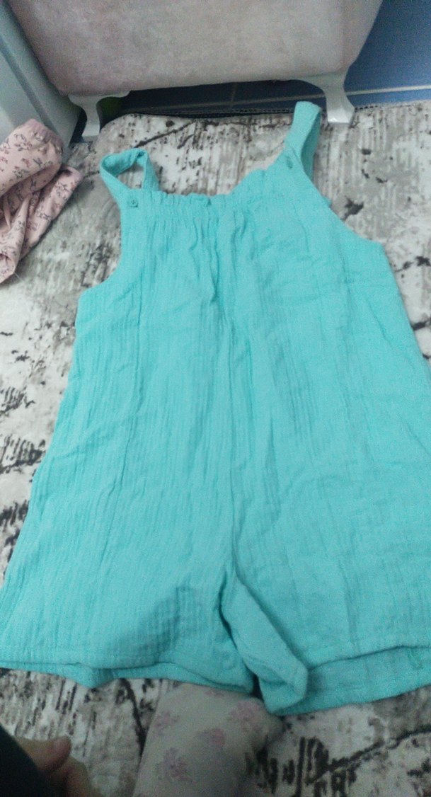 Kızlar için keten kumaştan, volan detaylı, turkuaz renkli, salaş kesim ve kolsuz tulum. Bohem tarzı rahatlık sunar.