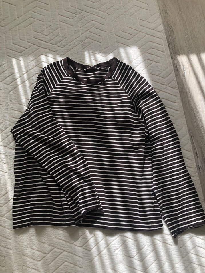 Pamuklu kumaştan, uzun kollu ve yuvarlak yakalı kız tişörtü. Kahverengi zemin üzerinde ince beyaz çizgilerle rahat ve şık bir görünüm sunar.