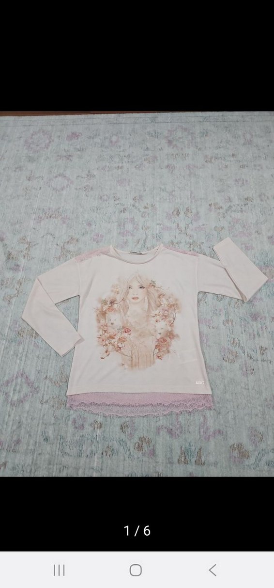 Pamuklu, uzun kollu, yuvarlak yakalı, bol kesim beyaz kız tişörtü, bohem desenli ve dantel detaylıdır.