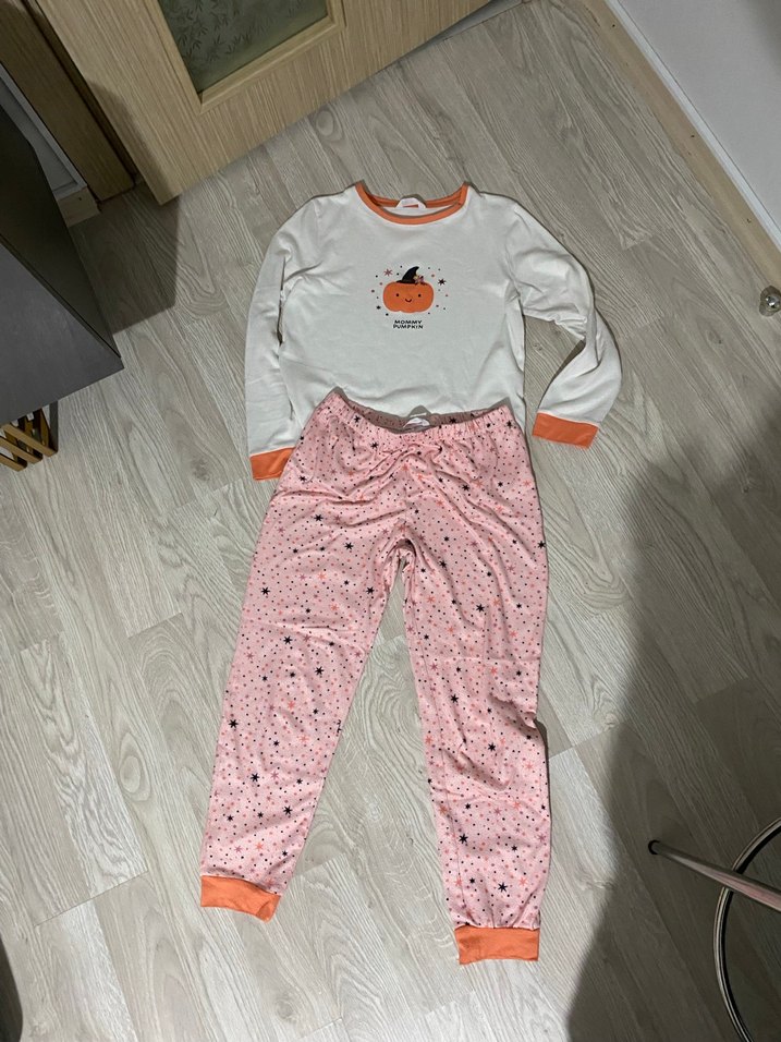 Kızlar için turuncu manşetli uzun kollu, beyaz üstünde balkabağı baskılı ve pembe yıldız desenli rahat pijama takımı.