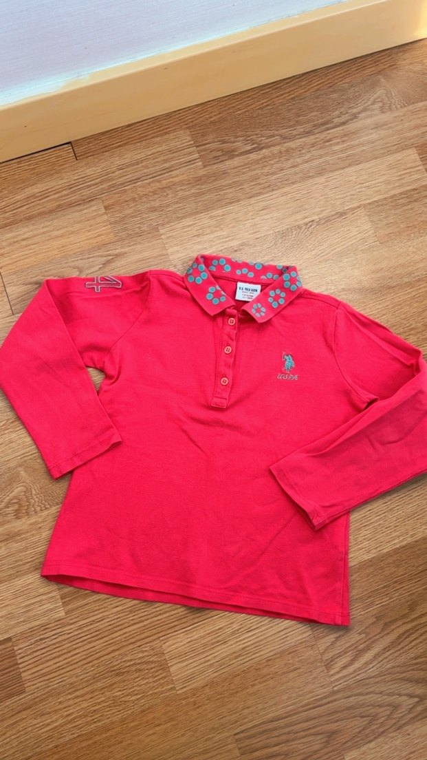 Uzun kollu, düğmeli ve renkli baskılı yakası olan kızlar için rahat kesim polo tişört. Yumuşak ve sıcak kumaştan üretilmiştir. Temiz kusuru yok