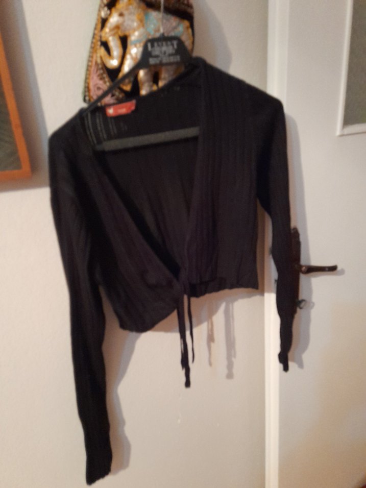 Kızlar için uzun kollu, yüksek yakalı ve kemerli siyah bolero. Keten kumaştan, goth tarzında ve desensiz.