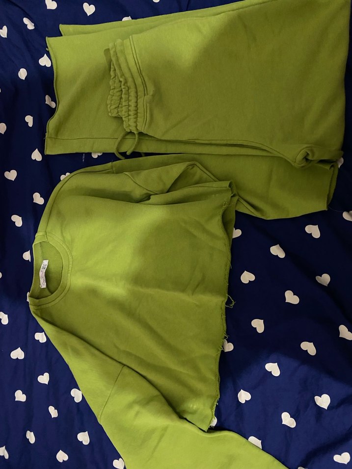 Koyu yeşil renkte, bol kesim, uzun kollu bisiklet yaka üst ve elastik bel bantlı eşofman altından oluşan sade, normcore tarzda kız eşofman takımı. S bedendir (26) bol olduğu için M-L giyenlere de uygundur