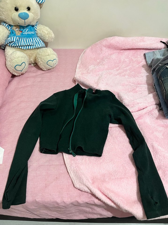 Dik yakalı, fermuarlı ve yeşil renkli kız çocuk ceketi. Sokak stili için uygun, yumuşak ve sıcak dokulu kumaştan yapılmıştır.