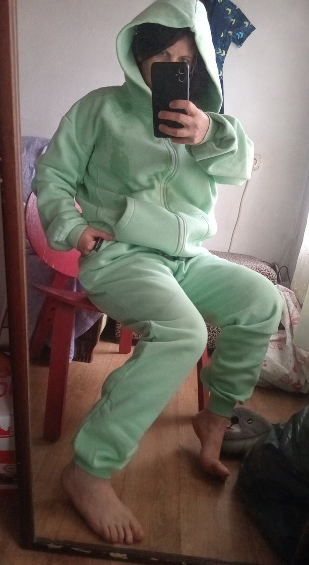 Pastel yeşil renkli kızlar için eşofman takımı, bol kesim, uzun kollu ve bisiklet yaka. Yumuşak kumaştan fermuarlı ve desensiz tasarıma sahip. Rahat ve trend görünüme uygun.goründugü gibi Afif leke var fiyat çok uygun kar tulumu olarak ta giyilir