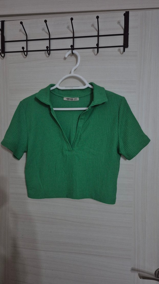 Kızlar için yeşil, kısa kollu polo tişört. Örme keten kumaştan, yakalı ve parlak dokusuyla sokak stiline uygun.