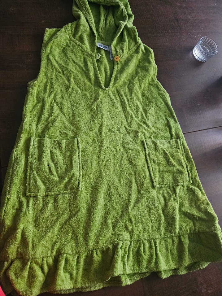 Kızlar için yeşil kolsuz keten panço, bol kesim, V yaka, fırfır detayı ve iki ön cepli. Parlak dokunuşlu bohem tarzı.