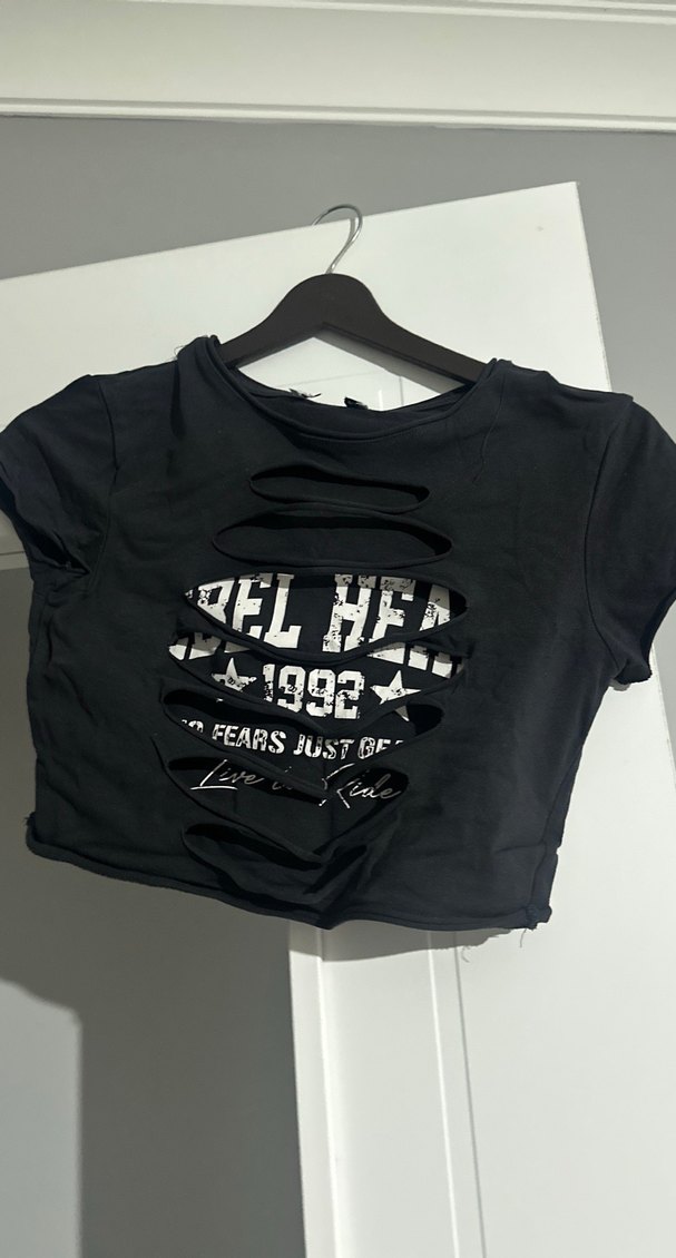 Koyu siyah, kısa kollu kız tişörtü, bol kesim ve yuvarlak yaka. Önünde baskılı rock punk desen ve yırtmaçlar bulunur. Denim kumaştan.