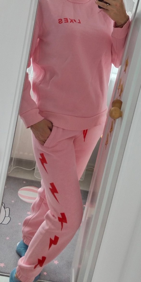 Kızlar için pembe, yumuşak kumaştan eşofman takımı. Çentikli yaka, uzun kollu, kırmızı baskılı şimşek desenli, şardonlu ve kalın.⚡