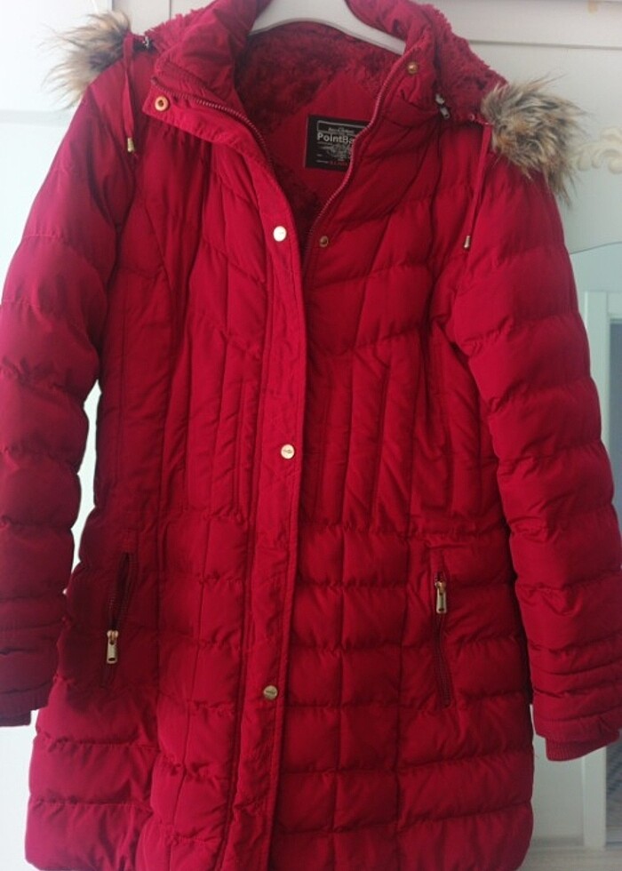 Kizrmizi kapşonlu mont