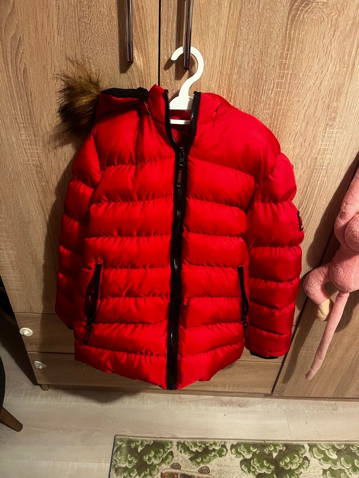 kırmızı renkli, kürk detaylı kapüşonlu çocuk montu. Kız- erkek kullanabilir. Cok temiz neredeyse hiç kullanılmadı.