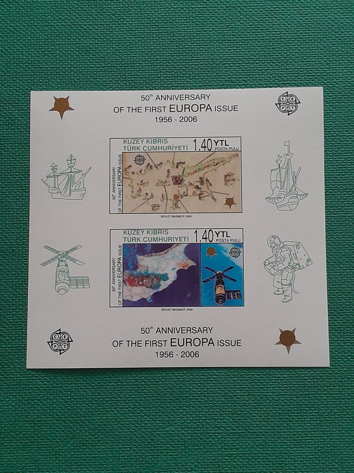 1956-2006 yılları arasında ilk Europa pulunun 50. yıl dönümünü kutlayan Kuzey Kıbrıs pullarından oluşan hatıra DAMGASIZ BLOK