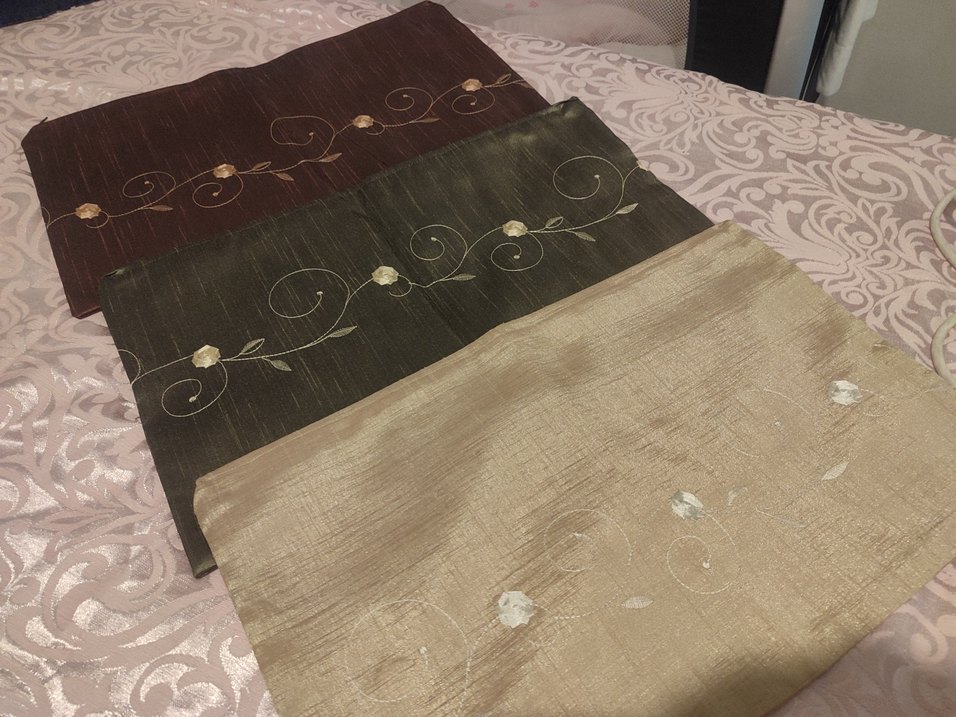 Klasik tarzda, koyu kahverengi bej ve yeşin tonlarında, zarif nakışlı çiçek desenleriyle 3 adet saten yastık kılıfı.