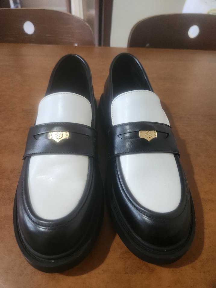 Parlak beyaz ve siyah detaylı, tokalı kadın loafer.yuet dışından geldi Blok topuklu ve kauçuk tabanlı, klasik goth tarzında, ofis için uygun. Yenidir bir kez bile kullanılmadı günlük rahat