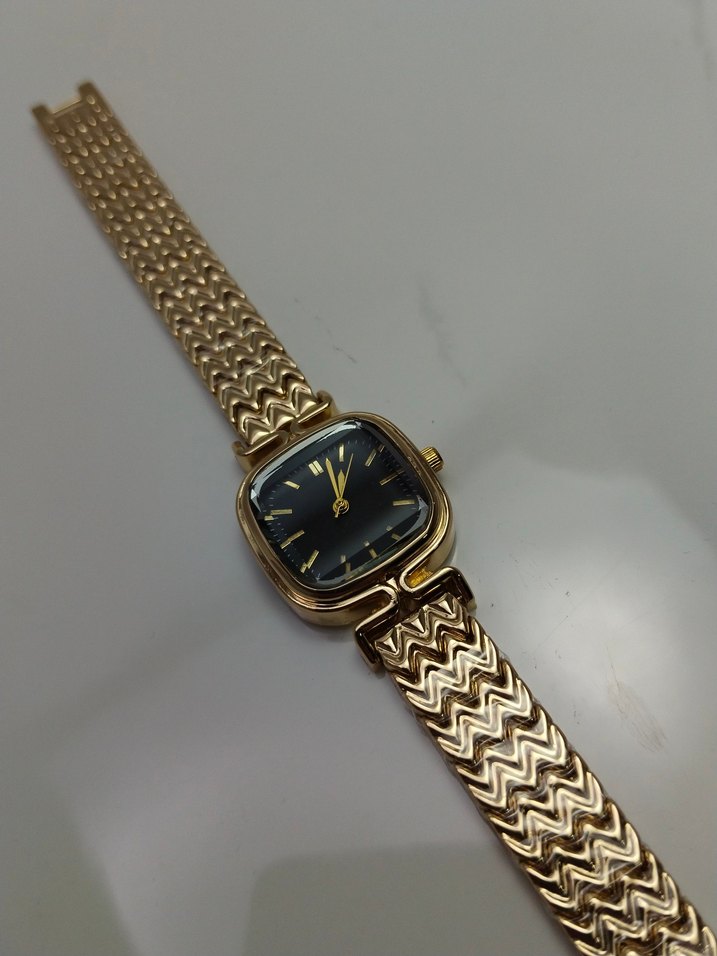 Koyu renkli kare kadran ve altın detaylara sahip, kemerli altın tonlu metal kayışlı kadın kol saati. ⌚