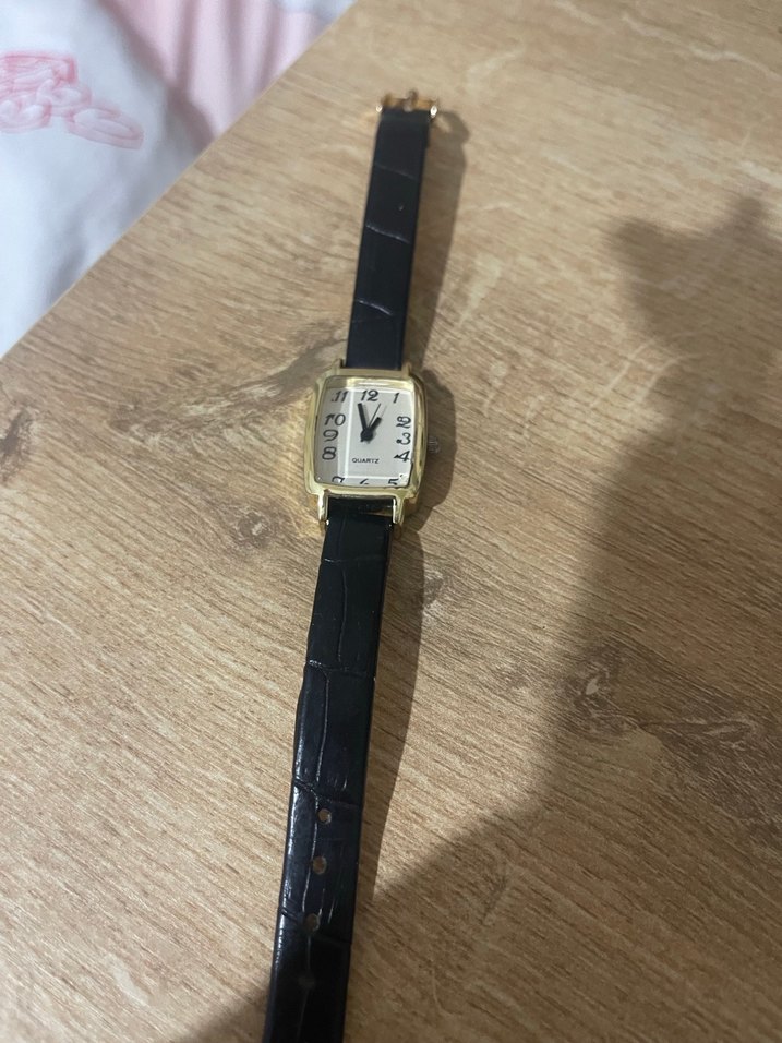 Altın renkli dikdörtgen kasaya ve koyu renk tokalı deri kayışa sahip klasik ve modern tarzda kadın kol saati. ⌚