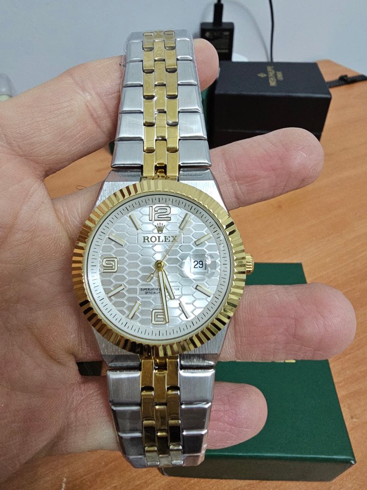 Erkek kol saati, parlak altın ve gümüş renkli metal kayışlı, klasik yuvarlak kadranlıdır. Tarih göstergesi ve desenli kadran bulunur. Saat ve kordon çeşidi çoktur bakabilirsiniz.