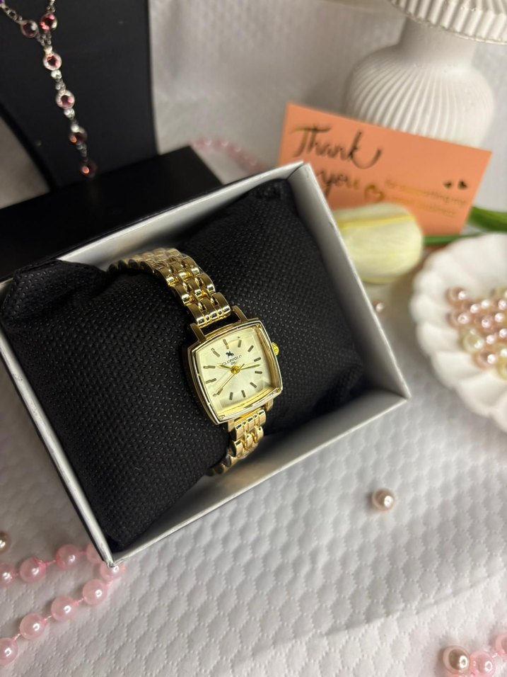 Parlak altın renkli, kemerli tasarıma sahip kadın kol saati, klasik zarafeti sokak modasıyla buluşturuyor. ⌚