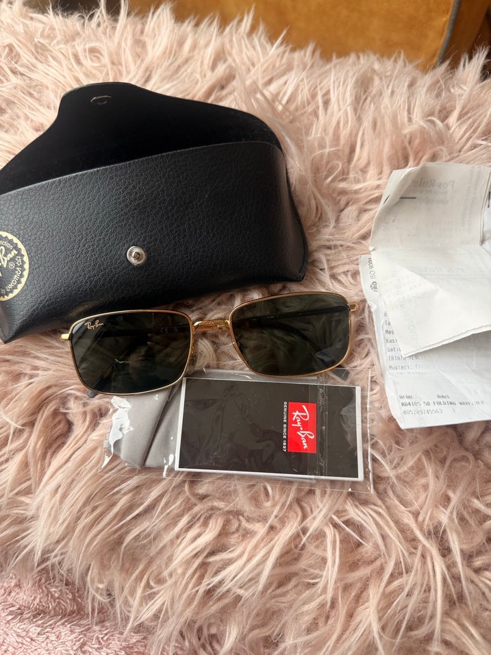 Ray-Ban güneş gözlüğü, klasik dikdörtgen tasarıma sahip koyu altın renk çerçeve ve yeşil camlarla. Siyah deri kılıf ve orijinallik kartı dahil. ️