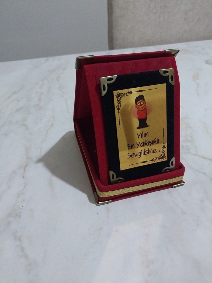 Parlak altın renkli baskılı, tokalı, klasik tarzda vintage plaket . Üzerinde anlamlı bir mesaj yer alıyor.