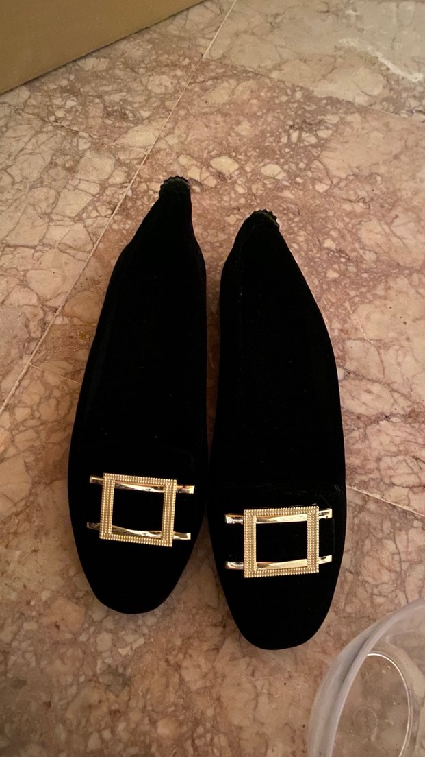 Koyu altın süet malzemeden, tokalı ve blok topuklu klasik Paris tarzı günlük kadın babetler. Ev içinde rahatça giyilir. Daha hiç kullanılmadı