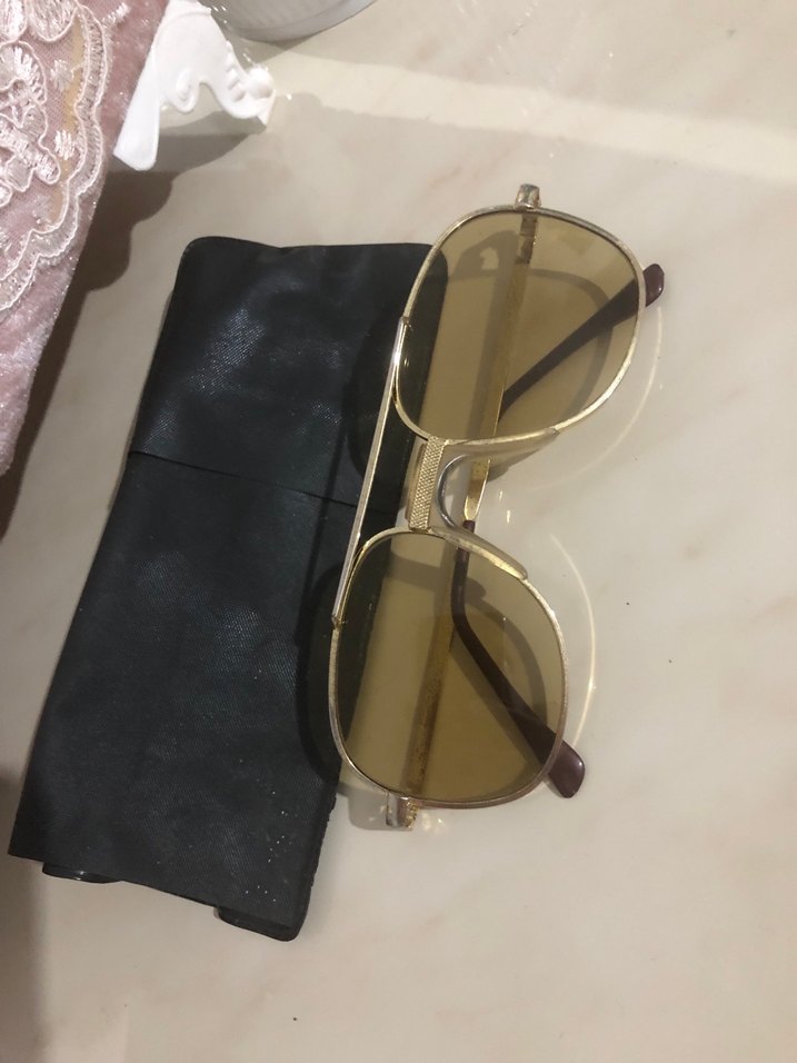 Parlak altın renkli, şeffaf kahverengi camlı klasik erkek güneş gözlüğü, siyah koruyucu kılıf ile birlikte.